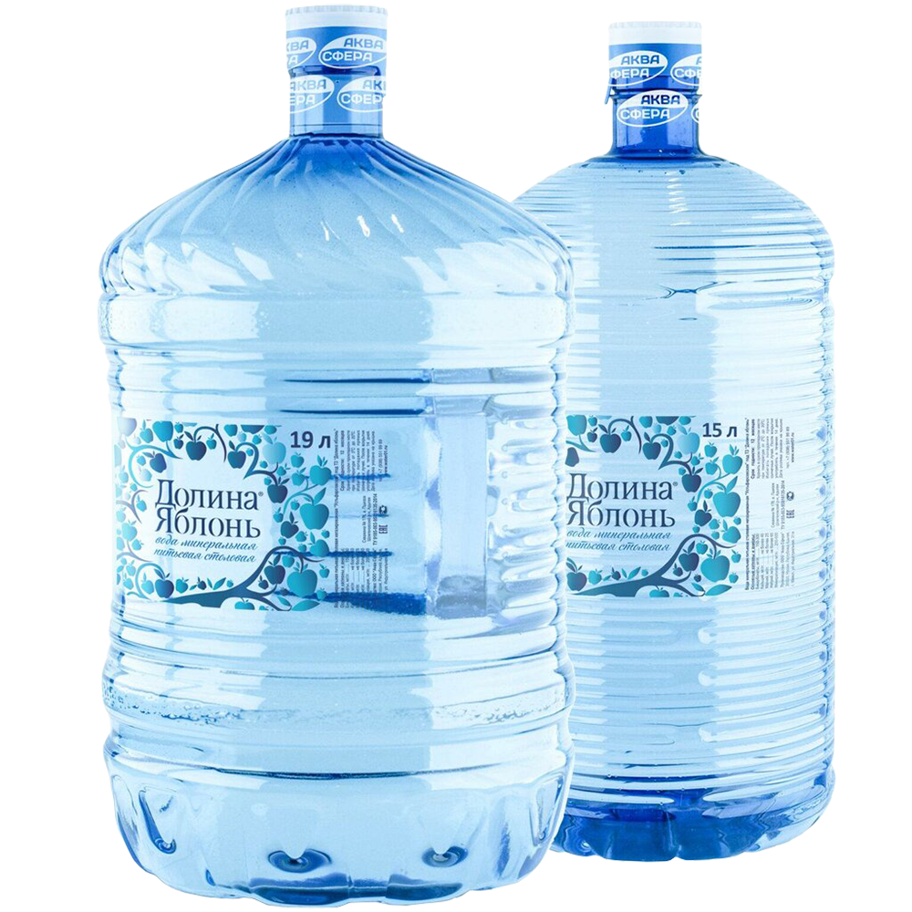 Минеральная вода «Долина Яблонь» поставляется в 4-х форматах. Бутыли для кулеров на 17 и 19 литров, а также обычные бутыли с резьбовой крышкой объёмом 5 и 10 литров.